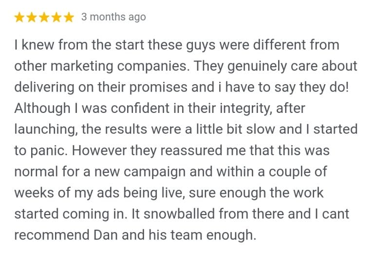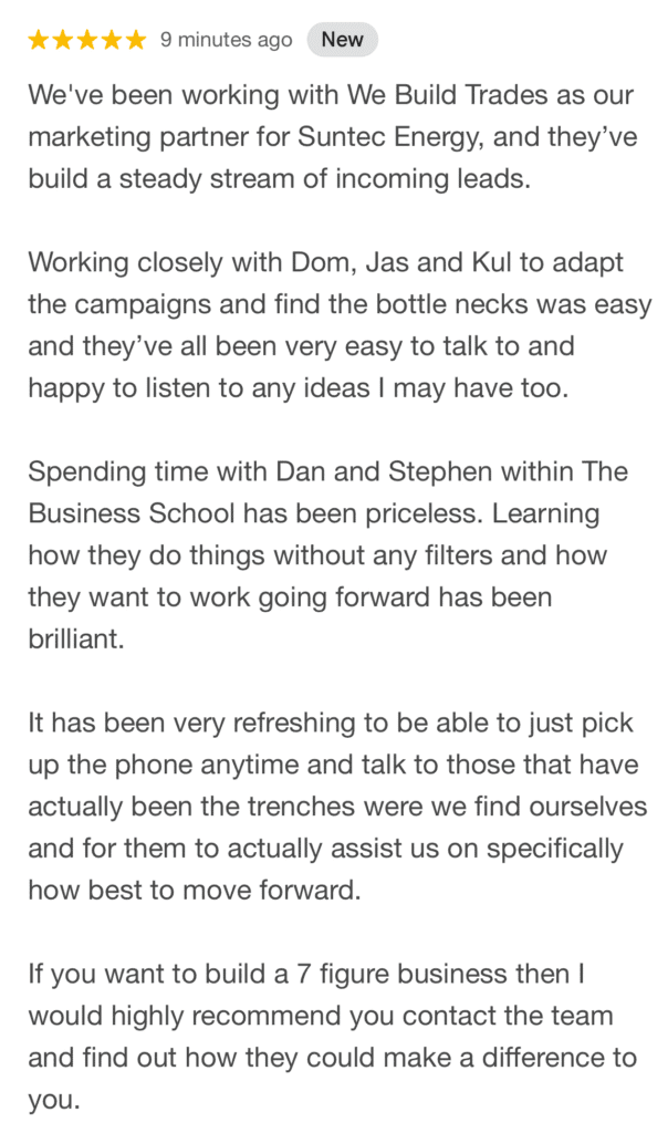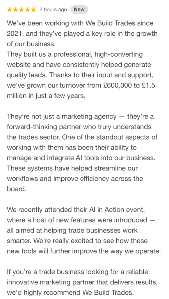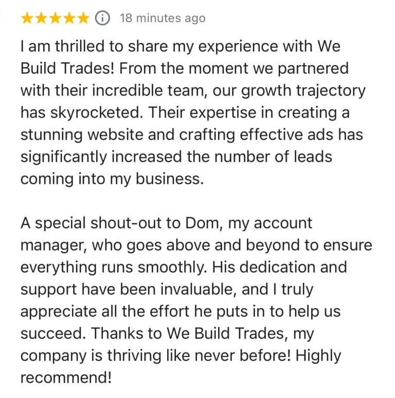 “[Placehoder Review] We’ve been working with We Build Trades since 2021, and the impact has been amazing. They built us a great website where customers can get instant quotes 24/7. We’ve seen a big increase in leads, hired more staff, and their AI and Trade Gang platform have helped us manage everything smoothly.